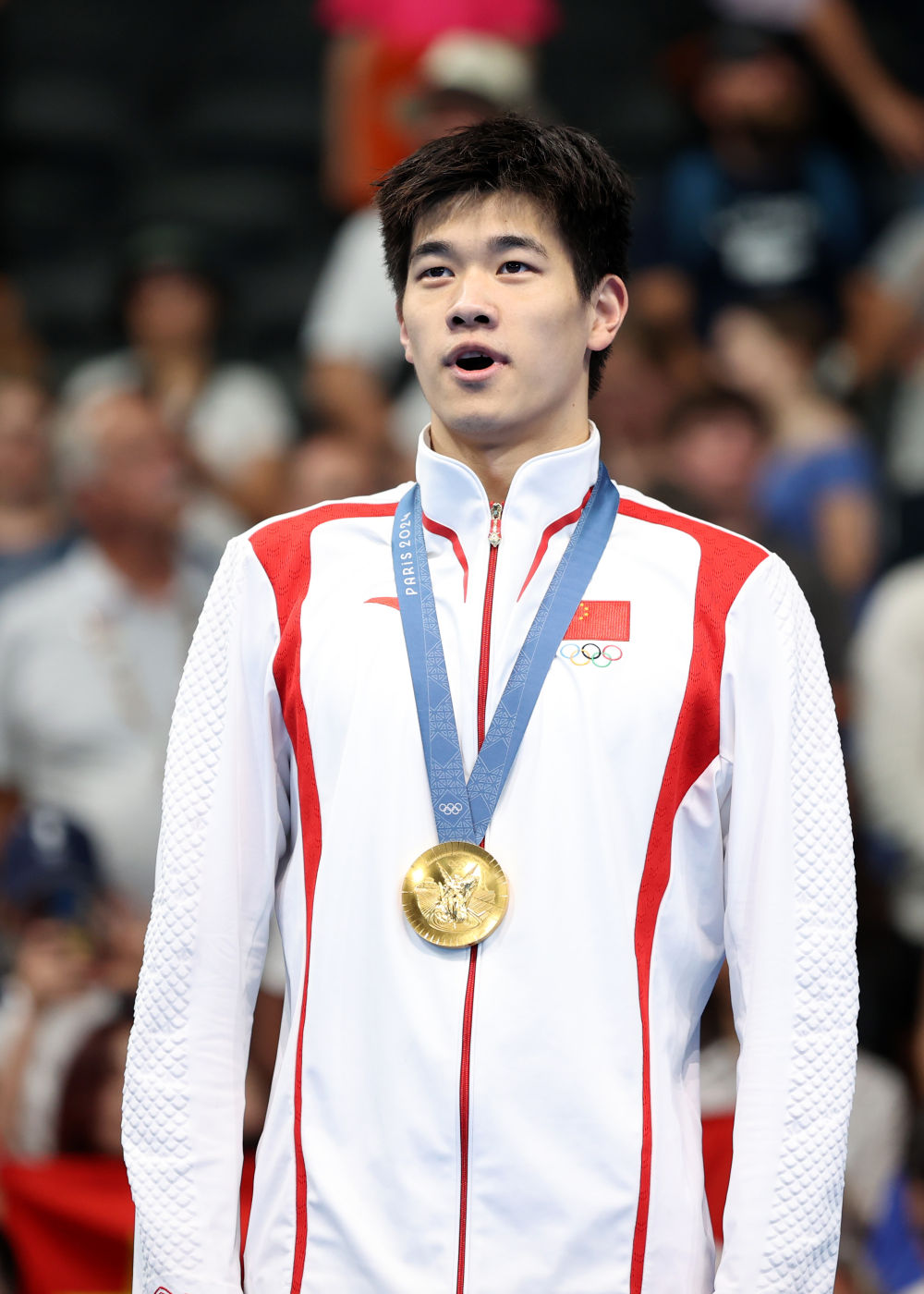 ↑中國選手潘展樂在頒獎(jiǎng)儀式上。新華社記者 杜宇 攝