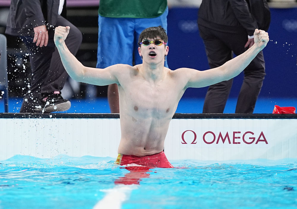 ↑中國選手潘展樂在比賽后慶祝。新華社記者 薛宇舸 攝