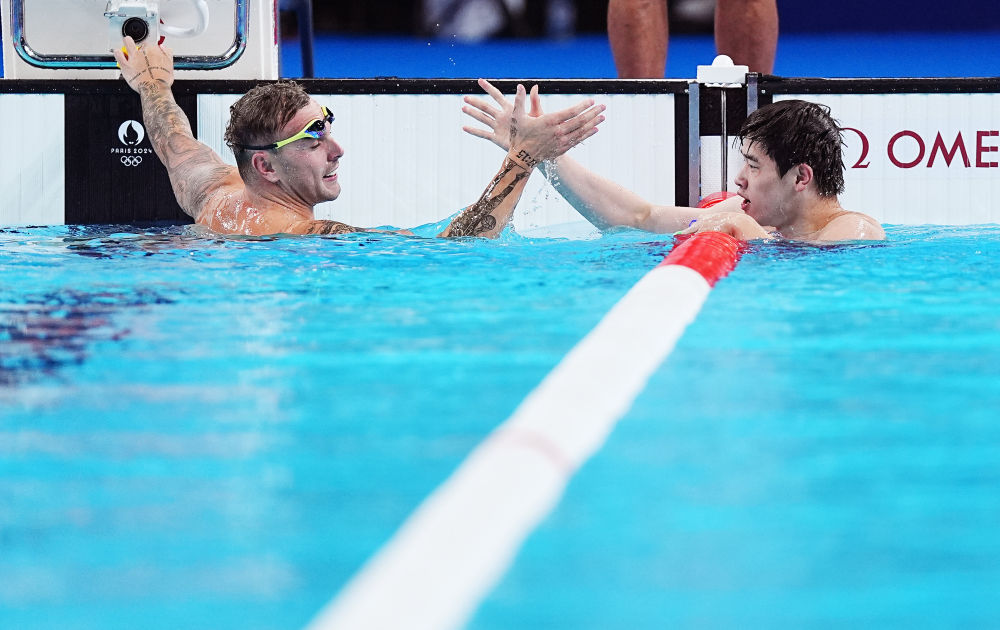 ↑中國選手潘展樂(右)與亞軍澳大利亞選手查默斯在比賽后慶祝。