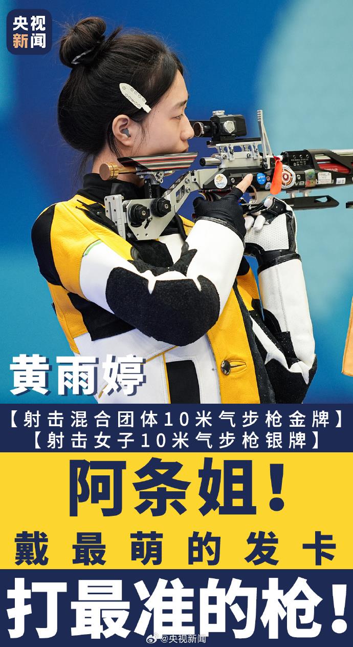 7月29日,在射擊女子10米氣步槍決賽中,“阿條姐”黃雨婷以0.1環(huán)之差獲得銀牌。