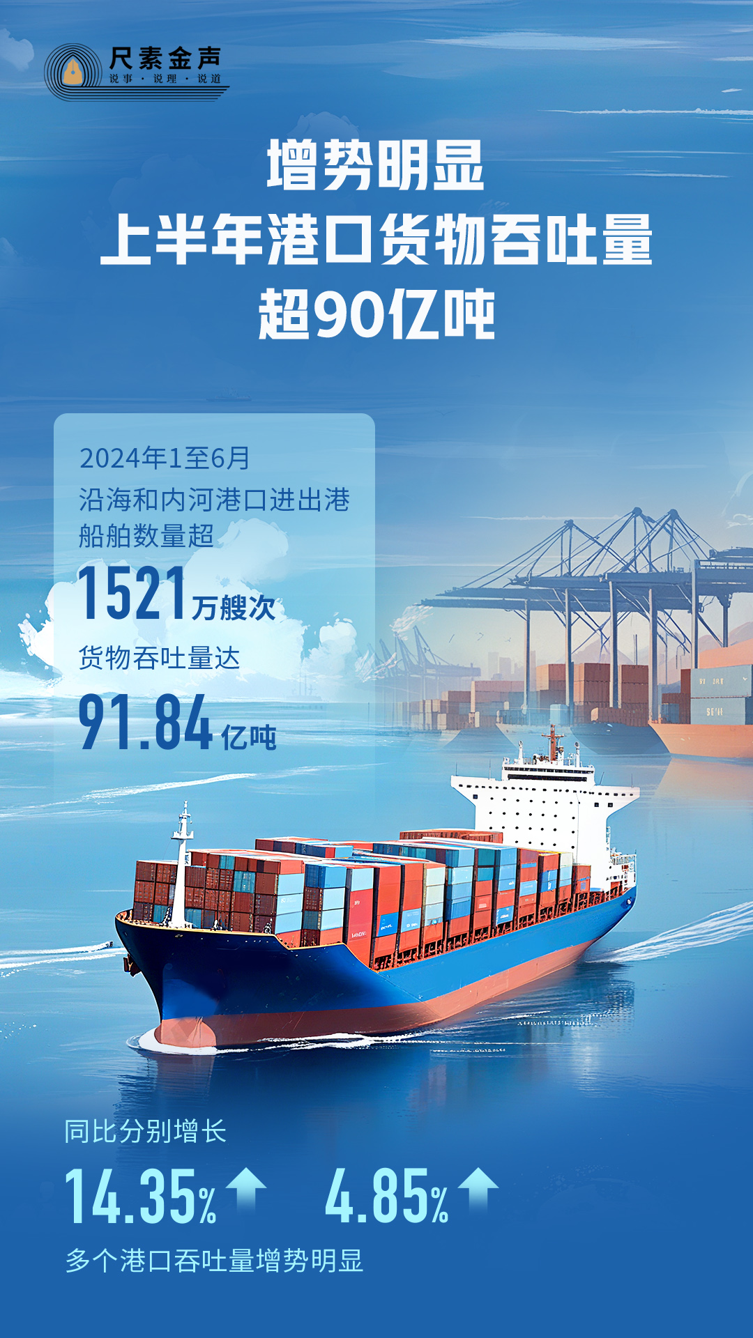 港口,貨物進(jìn)出口的重要門戶;港口貨物吞吐量,國(guó)民經(jīng)濟(jì)發(fā)展的“晴雨表”。日前,中國(guó)港口運(yùn)行“半年報(bào)”公布:今年1至6月,沿海和內(nèi)河港口進(jìn)出港船舶數(shù)量超1521萬(wàn)艘次,貨物吞吐量達(dá)91.84億噸,同比分別增長(zhǎng)14.35%、4.85%,多個(gè)港口吞吐量增勢(shì)明顯。
