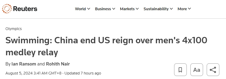 當?shù)貢r間8月4日,在游泳男子4×100米混合泳接力中,中國隊反超該項目的奧運“霸主”美國隊以及東道主法國隊,以3分27秒46奪冠。英國路透社(Reuters)4日的報道中寫道,現(xiàn)場歡呼聲震耳欲聾,中國隊的奪冠結(jié)束了美國隊64年來的不敗紀錄。賽后,美國選手萊恩·墨菲(Ryan Murphy)說:“今天中國隊的表現(xiàn)比我們要更好一些,向中國隊致敬,他們今晚的表現(xiàn)非常出色?!绷硪幻绹x手亨特·阿姆斯特朗(Hunter Armstrong)則關(guān)注到當天是中國選手潘展樂的生日,他表示:“這對他來說會是一份很酷的生日禮物!”