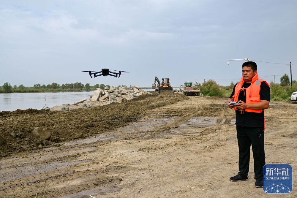 ↑在新疆阿克蘇地區(qū)沙雅縣蓋孜庫木鄉(xiāng)吐央村,搶險(xiǎn)人員利用無人機(jī)進(jìn)行巡查(8月3日攝)。
