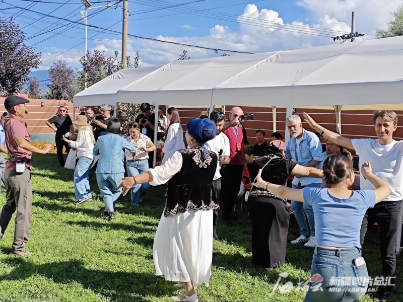 土耳其媒體人士在新源縣那拉提鎮(zhèn)英加爾村與村民同跳新疆舞。石榴云/新疆日?qǐng)?bào)記者 宋海波攝