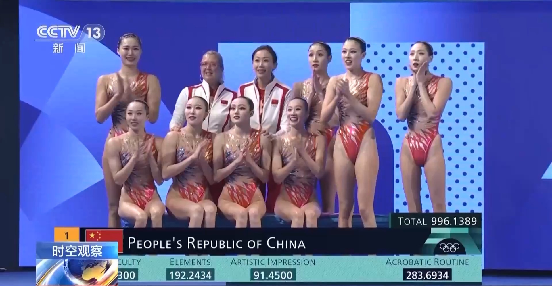 996.1389分!中國(guó)花游姑娘們以三場(chǎng)比賽穩(wěn)居第一的優(yōu)異表現(xiàn),贏得了中國(guó)花游在奧運(yùn)會(huì)上奪得的首枚金牌。