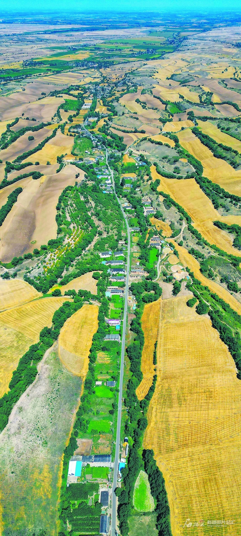 俯瞰木壘哈薩克自治縣英格堡鄉(xiāng)廟爾溝村(8月2日無人機攝)。通過廟爾溝村的鄉(xiāng)道串聯(lián)著戶戶農(nóng)家,也串聯(lián)出鄉(xiāng)村振興新圖景。 石榴云/新疆日報記者蔡增樂攝