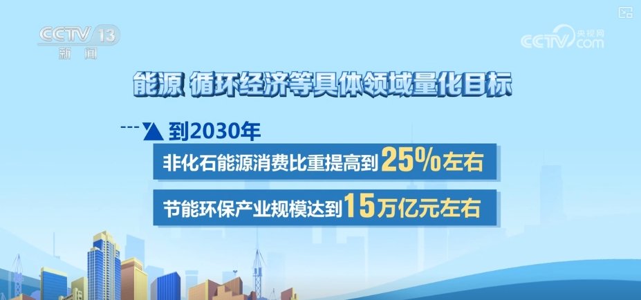 《意見》還針對能源、循環(huán)經(jīng)濟等具體領(lǐng)域提出一些量化目標。比如,到2030年,非化石能源消費比重提高到25%左右;節(jié)能環(huán)保產(chǎn)業(yè)規(guī)模達到15萬億元左右。