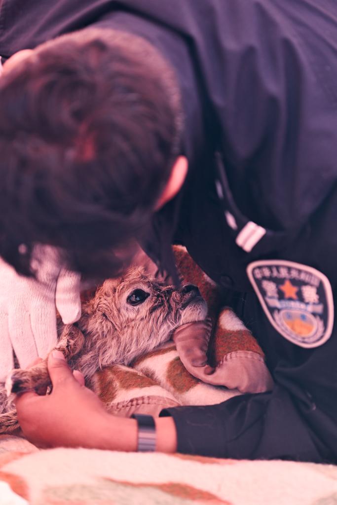 很難想象,這些面龐黝黑、身材魁梧的藏族漢子會趴在一只小藏羚羊身邊,一邊輕柔地給它擦拭身體,一邊像安撫哭鬧的孩子一樣,輕聲細語地告訴它:“不要害怕,我們來救你了”。