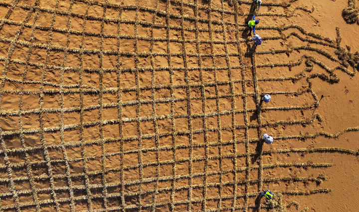 治沙工人在寧夏中衛(wèi)市境內(nèi)的騰格里沙漠鋪設(shè)刷狀網(wǎng)繩式草方格沙障(2024年5月30日攝,無人機照片)。