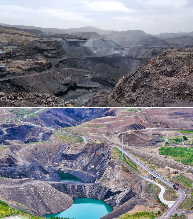 拼版照片,上圖為:位于寧夏石嘴山市的賀蘭山石炭井礦區(qū)(2017年5月30日攝,新華社發(fā));下圖為:2024年8月6日拍攝的修復(fù)治理后的賀蘭山石炭井礦區(qū)(無人機照片,新華社記者馮開華攝)。