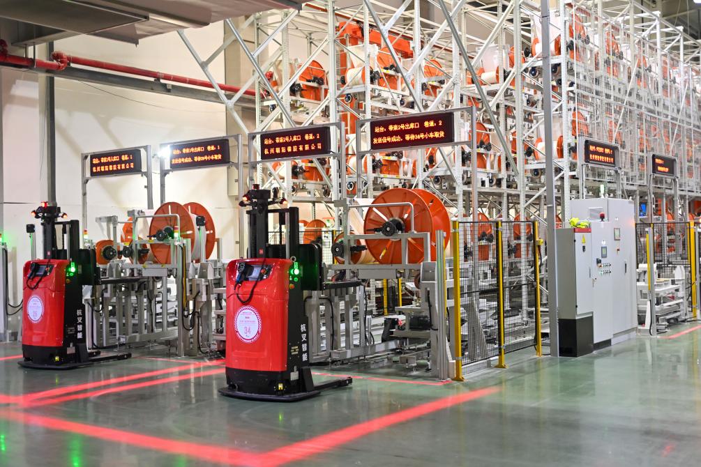 7月26日,無人叉車在杭州中策錢塘實業(yè)有限公司輪胎數(shù)字工廠車間內(nèi)裝運物料。新華社記者 江漢 攝
