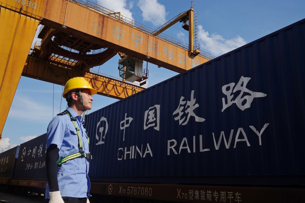工作人員在南寧國(guó)際鐵路港檢查中越班列裝運(yùn)情況。(國(guó)鐵南寧局供圖)