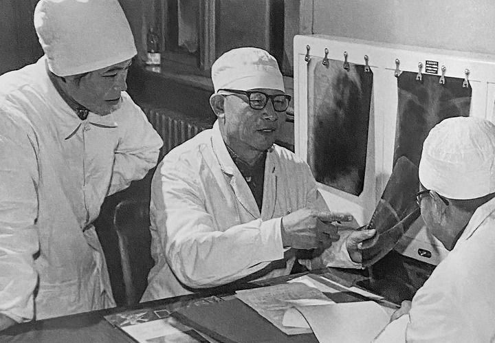 1980年1月16日,中日友好醫(yī)院首任院長辛育齡(中)在內(nèi)蒙古結(jié)核病院與胸外科醫(yī)師討論病例(翻拍照片)。 新華社發(fā)