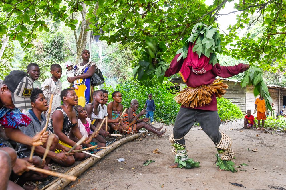 7月11日,在喀麥隆南部大區(qū)克里比市,恩杜馬萊村的俾格米人村民舉行慶祝活動。新華社發(fā)(科普索攝)