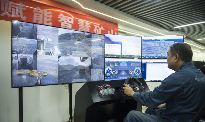 2024年4月11日,技術(shù)人員在位于四川省攀枝花市的攀鋼礦業(yè)朱蘭鐵礦智慧管控中心遠(yuǎn)程操控?zé)o人自動(dòng)駕駛礦車。新華社記者 張豪夫 攝