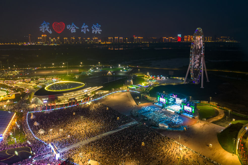 人們?cè)诠枮I國(guó)際啤酒節(jié)現(xiàn)場(chǎng)觀看無(wú)人機(jī)表演。新華社記者 張濤 攝