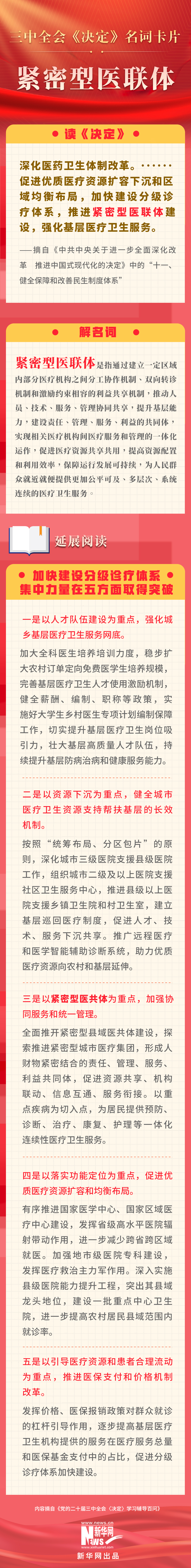 黨的二十屆三中全會審議通過了《中共中央關于進一步全面深化改革、推進中國式現(xiàn)代化的決定》。新華網(wǎng)依據(jù)《黨的二十屆三中全會〈決定〉學習輔導百問》,制作三中全會《決定》系列名詞卡片,和大家一起來深入學習領會二十屆三中全會精神。本期名詞是“緊密型醫(yī)聯(lián)體”。