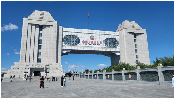 滿洲里口岸于1902年建成,在現(xiàn)國(guó)門處先后建設(shè)了四代國(guó)門,如今的國(guó)門建筑面積5905平方米,總長(zhǎng)105米,寬46.6米,高43.7米,是我國(guó)邊境線上最大的國(guó)門,也是弘揚(yáng)國(guó)威、展現(xiàn)國(guó)力的標(biāo)志性建筑。