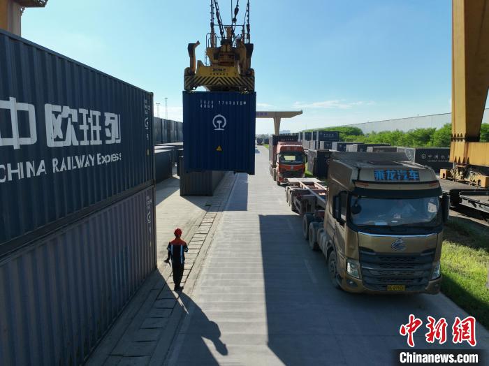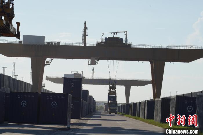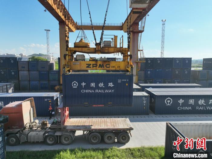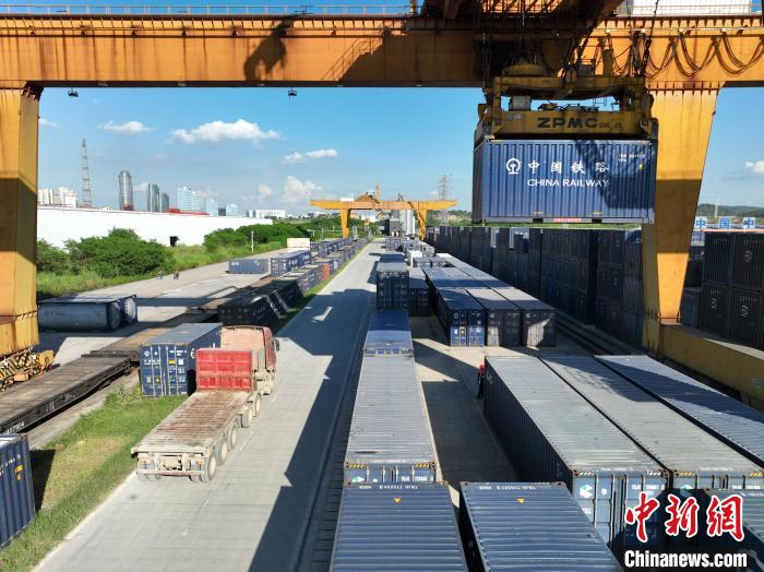 8月26日,廣西南寧國際鐵路港內(nèi),鐵路職工頂著下午的烈日,正在為發(fā)往越南的貨運班列裝卸貨物。該鐵路港是廣西始發(fā)中越班列的核心場站。國鐵南寧局提供的信息顯示,今年前7個月,廣西始發(fā)中越班列累計發(fā)運貨物6850標箱,同比增長16倍;其中7月份發(fā)運1922標箱,超過今年一季度發(fā)運量總和,為今年以來第三次刷新單月發(fā)運量紀錄。圖為集裝箱擺滿場站,等待裝車。王以照 攝