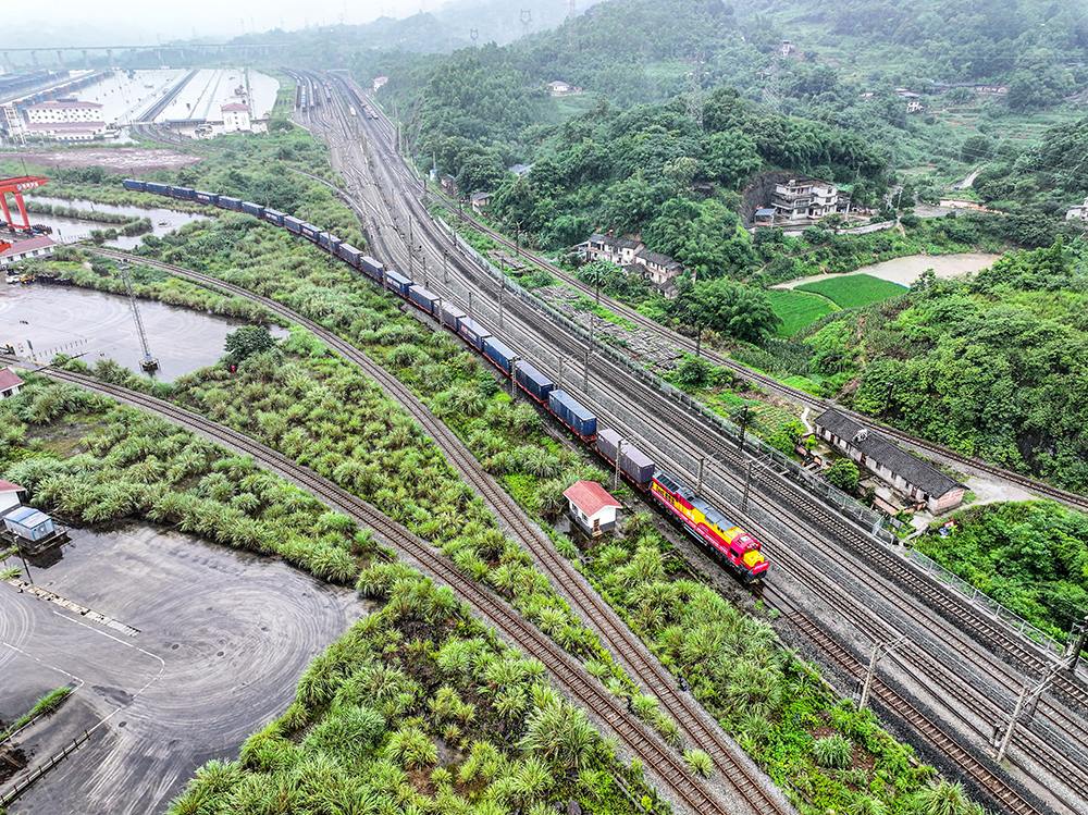 2024年6月27日,西部陸海新通道中老泰馬跨境鐵路班列在重慶江津小南埡站發(fā)車(無人機(jī)照片)。新華社記者唐奕攝