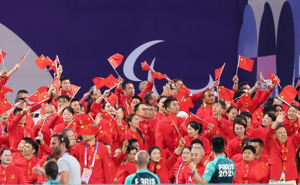 8月28日,中國體育代表團(tuán)在巴黎殘奧會開幕式上入場。新華社記者 侯俊 攝
