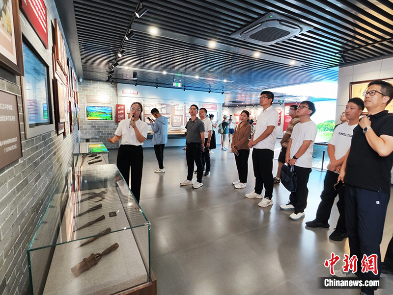 “紅旗躍過(guò)汀江”文創(chuàng)服務(wù)中心內(nèi),講解員向采訪團(tuán)成員講解歷史故事。劉越 攝