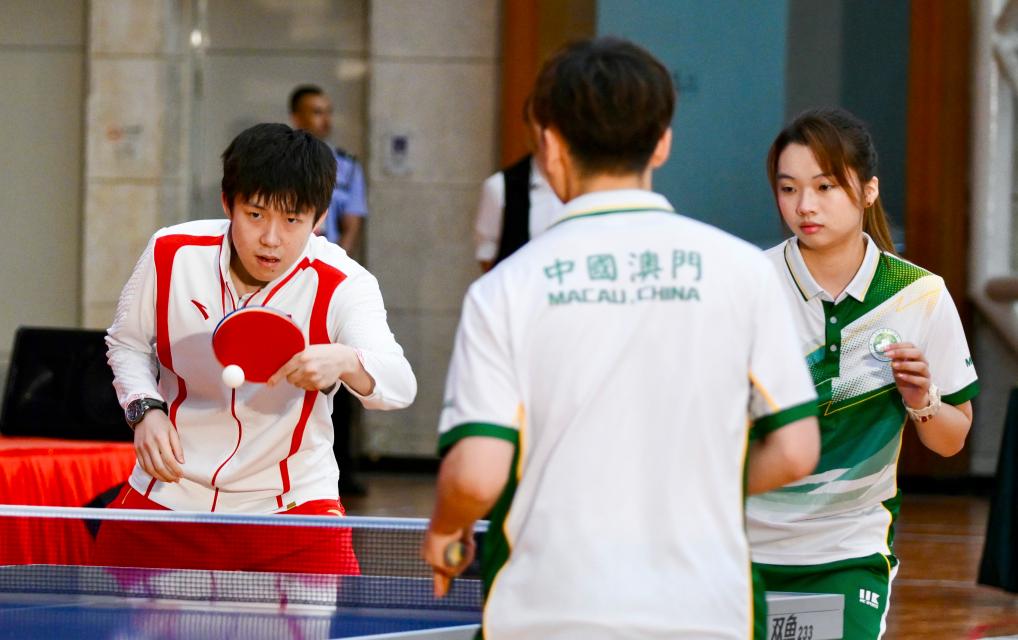 9月1日,乒乓球運(yùn)動(dòng)員王楚欽(左)與澳門(mén)運(yùn)動(dòng)員切磋球技。新華社記者 郭雨祺 攝