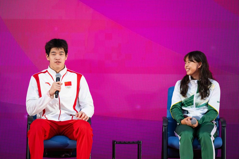 9月1日,游泳運(yùn)動(dòng)員潘展樂(lè)(左)在活動(dòng)中回答澳門(mén)運(yùn)動(dòng)員的提問(wèn)。新華社記者 張金加 攝