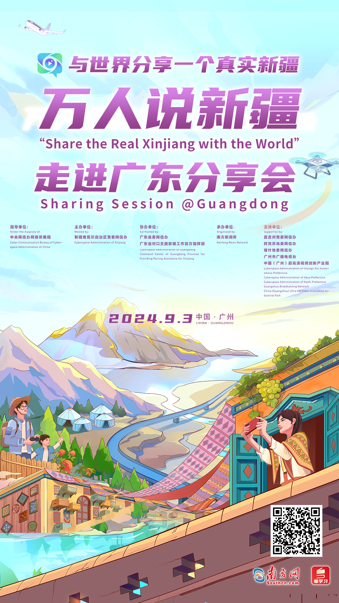 本次分享會(huì)將圍繞“讀懂新疆”“新粵同心”“共繪‘疆’來(lái)”三個(gè)篇章開(kāi)展圓桌對(duì)話和視頻連線。國(guó)內(nèi)知名學(xué)者將從歷史文化、經(jīng)濟(jì)發(fā)展、民族特色、風(fēng)土人情等不同角度進(jìn)行深層次的分享解讀,展示新疆的多元文化和人文情懷,把新疆溫柔地說(shuō)與全世界。新粵合作親身參與人士,將講述新粵兩地從“單向援建”到“相互賦能”,攜手共進(jìn)的故事。粵港澳大灣區(qū)青年、海內(nèi)外博主等“跨界”人士將暢談新疆未來(lái)發(fā)展,共話美好“疆”來(lái)。