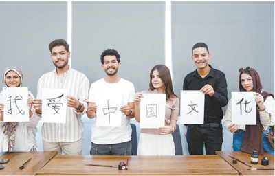 7月3日,埃及中國(guó)圖書中心揭牌儀式在埃及開(kāi)羅巴德?tīng)柎髮W(xué)舉辦。圖為參加活動(dòng)的埃及大學(xué)生展示書法。