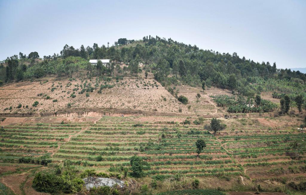 這是8月15日在盧旺達(dá)南方省拍攝的一處使用等高線種植巨菌草活籬笆和梯田套種農(nóng)作物模式的水土保持田。