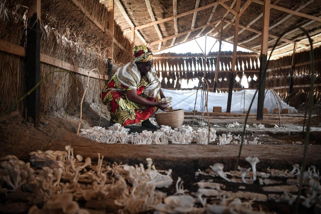 2月6日,在中非共和國達(dá)馬拉,法蒂瑪在菇棚內(nèi)收獲菌草菇。