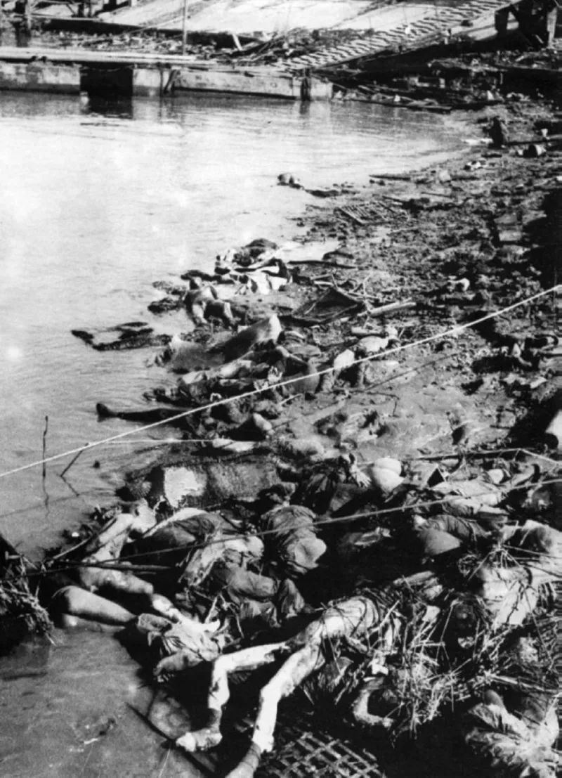 圖為被日軍屠殺的南京市民尸體堆滿河岸。