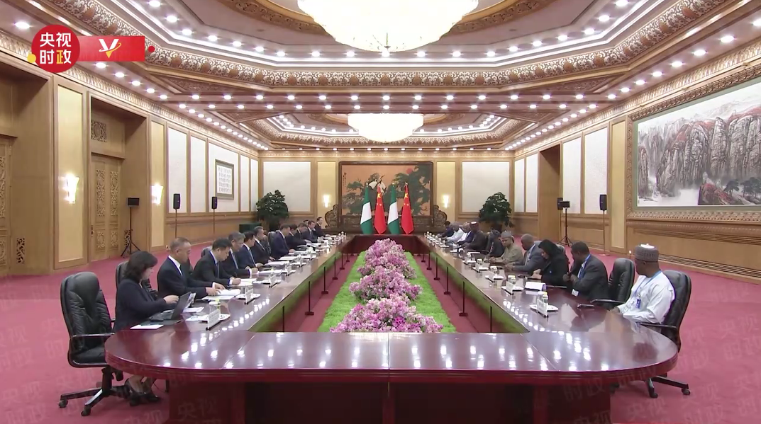 習近平指出,很高興結識總統(tǒng)先生,歡迎你來華出席中非合作論壇峰會并對中國進行國事訪問。尼日利亞是具有重要影響的非洲大國,擁有巨大人口規(guī)模和發(fā)展?jié)摿?。相信在你的領導下,尼日利亞國家發(fā)展改革事業(yè)將取得更大成就。