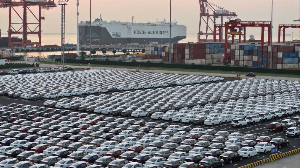 汽車運(yùn)輸船“禮諾極光”輪靠泊江蘇省蘇州港太倉港區(qū),即將裝載2336輛汽車首航歐洲(無人機(jī)照片,8月23日攝)。