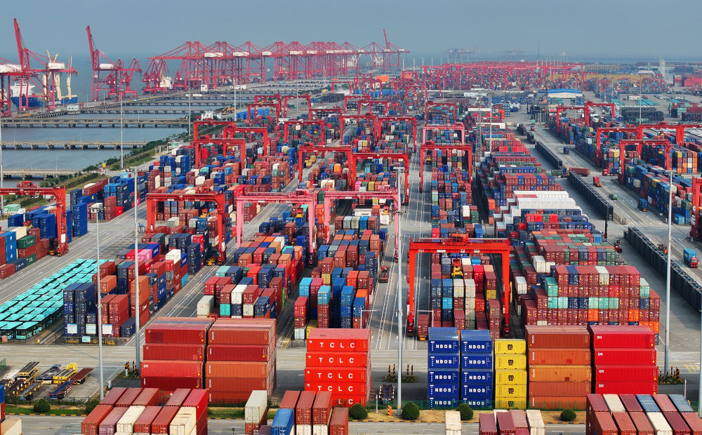 江蘇省蘇州港太倉港區(qū)集裝箱碼頭,集裝箱吞吐作業(yè)繁忙(無人機(jī)照片,8月10日攝)。