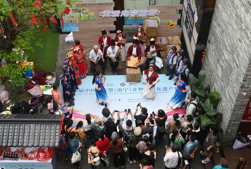 今年“三月三”期間,在南寧市三街兩巷的慶?;顒蝇F(xiàn)場,多彩非遺文化展演吸引游客駐足欣賞。新華社記者陸波岸 攝