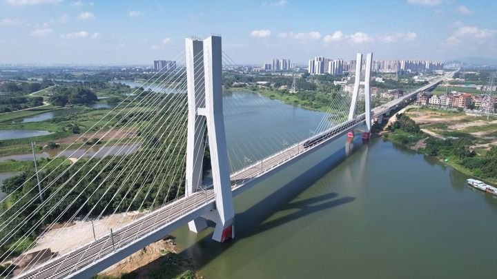 2023年9月26日,廣汕高鐵正式開通運(yùn)營(yíng),列車經(jīng)過位于廣州市增城區(qū)的廣汕高鐵增江特大橋(無人機(jī)照片)。新華社記者 田建川 攝