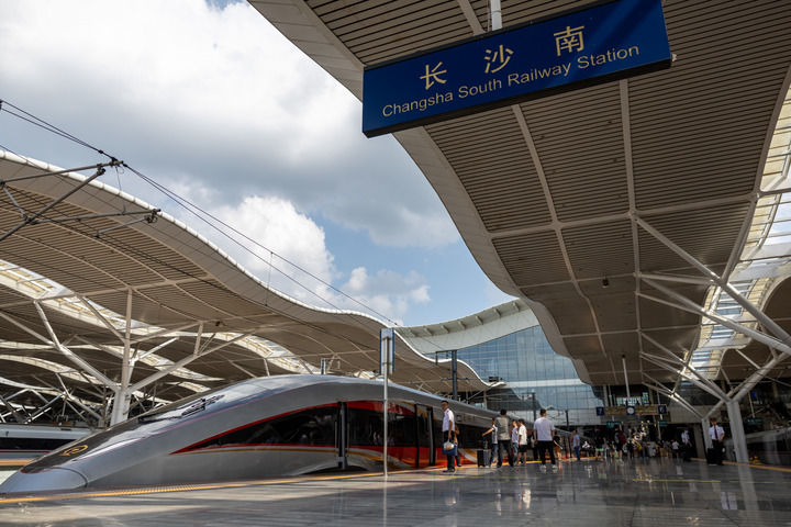 2024年6月15日,武漢至深圳北的G875次列車經(jīng)停長(zhǎng)沙南站。當(dāng)日,京廣高鐵武廣段復(fù)興號(hào)動(dòng)車組列車按時(shí)速350公里高標(biāo)運(yùn)營(yíng),標(biāo)志著京廣高鐵武漢至廣州段安全標(biāo)準(zhǔn)示范線全面建成,京廣高鐵全線實(shí)現(xiàn)復(fù)興號(hào)動(dòng)車組列車按時(shí)速350公里高標(biāo)運(yùn)營(yíng)。新華社記者 伍志尊 攝