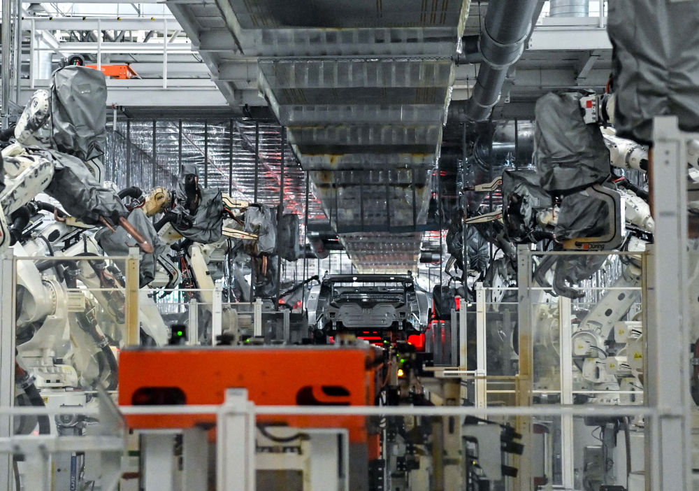 8月5日,在位于吉林省長春市一汽紅旗制造中心繁榮廠區(qū)的焊裝車間內(nèi),焊裝機(jī)器人在生產(chǎn)線上焊接車身。新華社記者 顏麟蘊(yùn) 攝