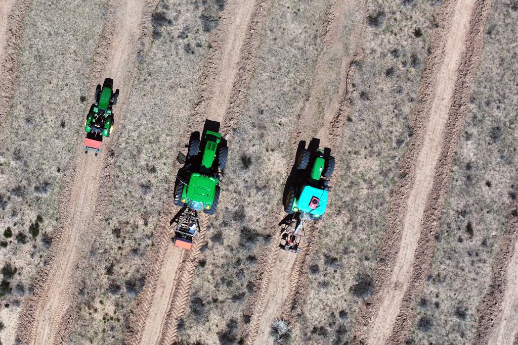 6月15日,在地處黃河“幾字彎”的內(nèi)蒙古庫布其沙漠防沙治沙項目區(qū),工人駕駛牽引播種機(jī)種檸條(無人機(jī)拍攝)。新華社記者 李云平 攝