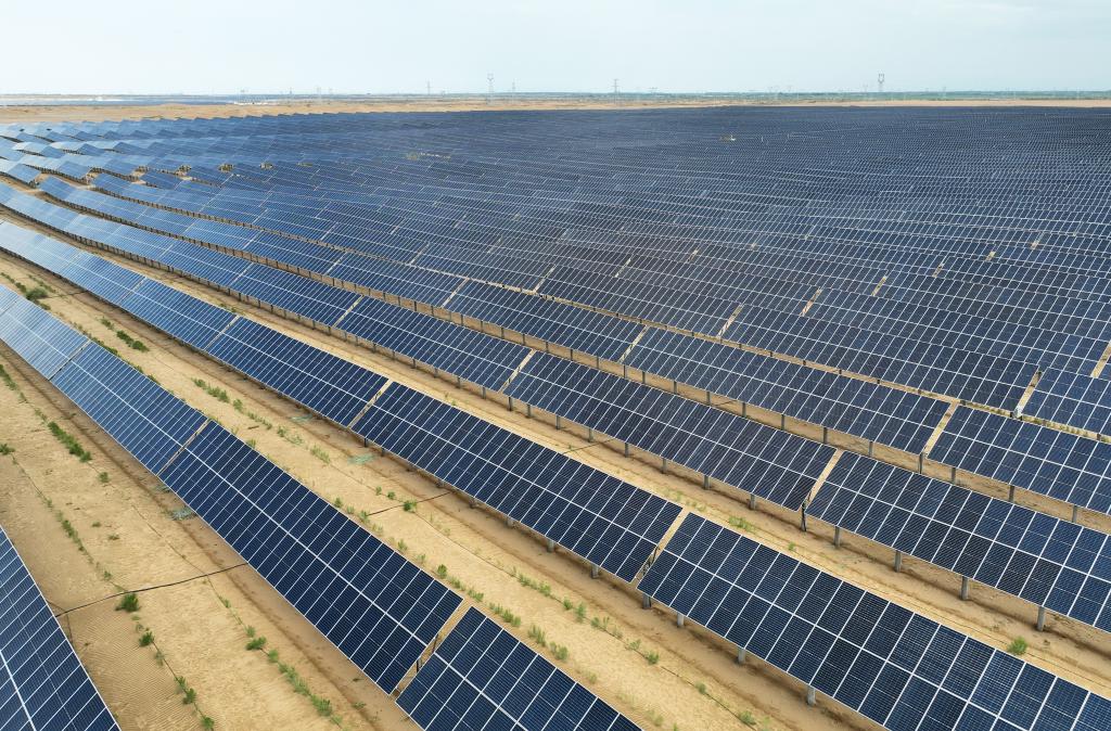 這是7月5日拍攝的內(nèi)蒙古烏蘭布和沙漠防沙治沙和風(fēng)電光伏一體化項目區(qū)(無人機(jī)拍攝)。新華社記者 李云平 攝