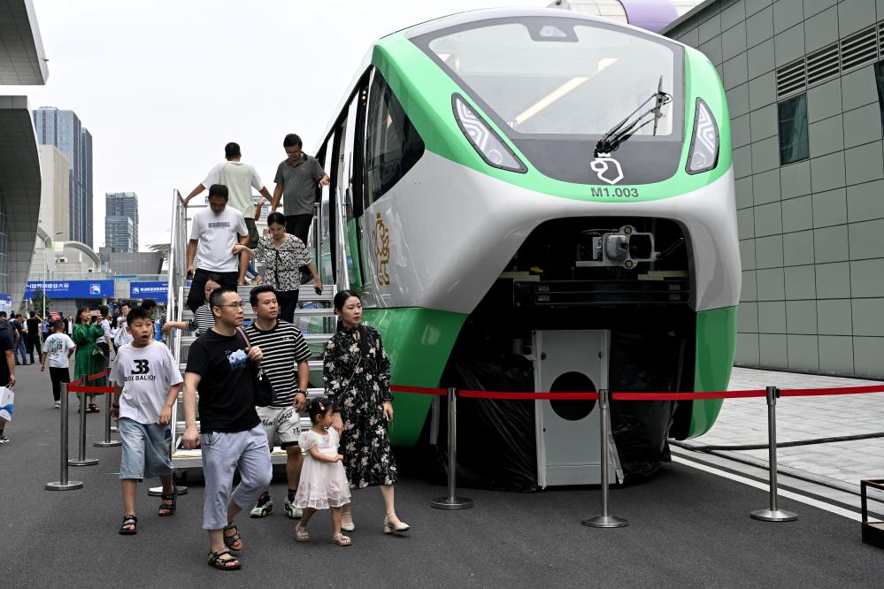 9月21日,在2024世界制造業(yè)大會(huì)上,人們參觀體驗(yàn)一款跨座式單軌列車。新華社記者 黃博涵 攝