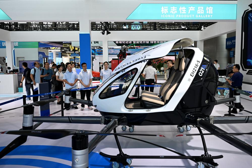 9月20日,在2024世界制造業(yè)大會(huì)上,人們了解一款載人級(jí)無人駕駛電動(dòng)垂直起降航空器。新華社記者 黃博涵 攝
