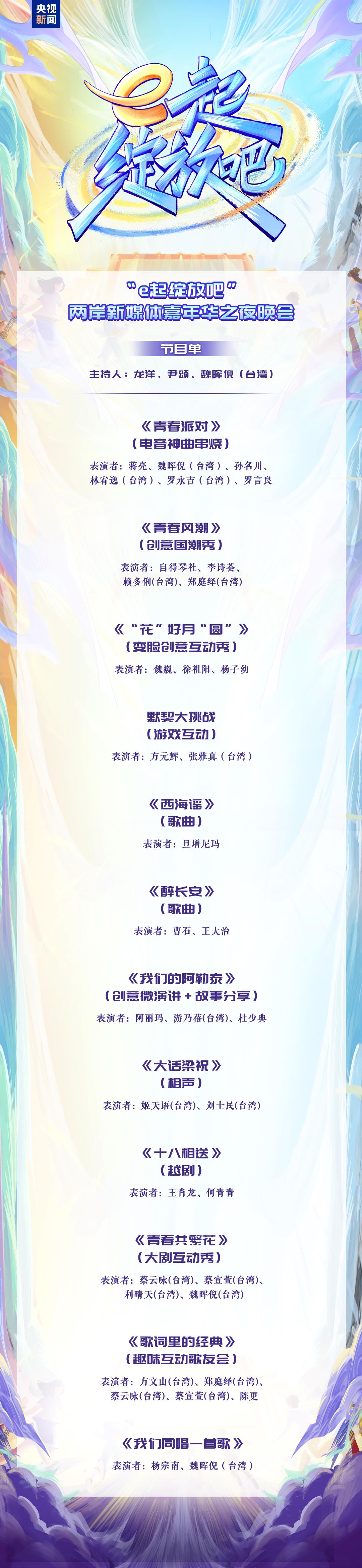 “e起綻放吧”兩岸新媒體嘉年華之夜晚會今晚(9月25日)20時(shí)將在看臺海、大灣區(qū)之聲、央視頻、央視新聞、央視財(cái)經(jīng)等平臺播出。來自兩岸的文化名人、網(wǎng)紅博主、青年代表以“才藝+故事”的融合表現(xiàn)形式,結(jié)合影視劇、國潮音樂、舞蹈、詩詞歌賦、旅游美食等文化元素,共尋文化記憶、共話青春故事、共融民族情感,共享一場心手相牽的青春盛宴。兩岸年輕人在晚會中同唱一首歌、同追一部劇、同創(chuàng)一首詩,展現(xiàn)兩岸交流交往、融合發(fā)展中的蓬勃青春力量。