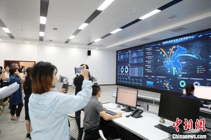 圖為采訪(fǎng)團(tuán)成員走訪(fǎng)西部陸海新通道運(yùn)營(yíng)調(diào)度中心。梁欽卿 攝