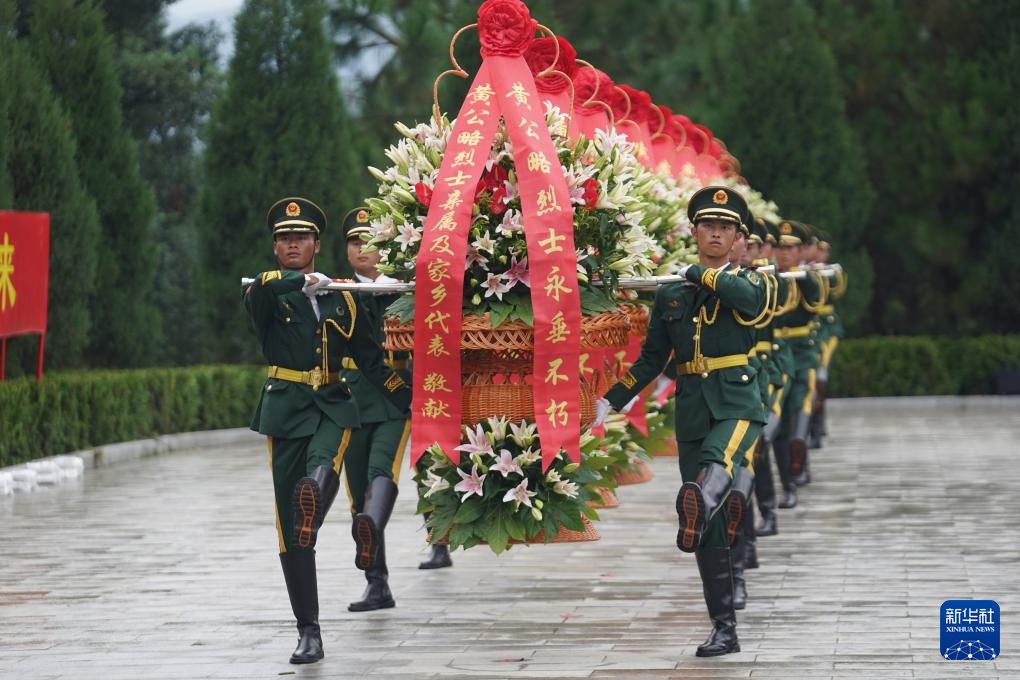9月25日,禮兵向烈士墓敬獻(xiàn)花籃。新華社記者 周密 攝