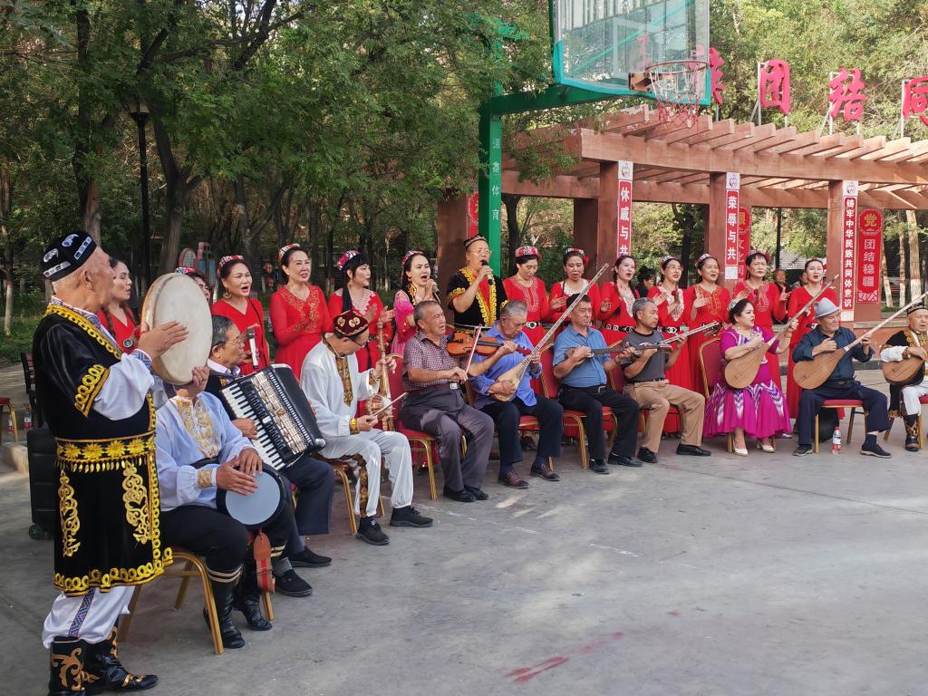 9月19日,庫爾勒市朝陽街道團(tuán)結(jié)社區(qū)“石榴籽藝術(shù)團(tuán)”團(tuán)長卡得爾·克衣木正帶著團(tuán)員們?yōu)榫用癖硌?。新華社記者顧煜 攝