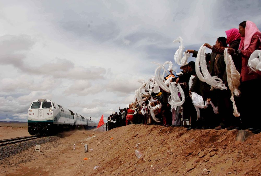 2006年7月1日,青藏鐵路全線通車。在青海沱沱河大橋橋頭,當?shù)厝罕姎g迎從格爾木出發(fā)的“青1”次列車。新華社記者 陳燮 攝