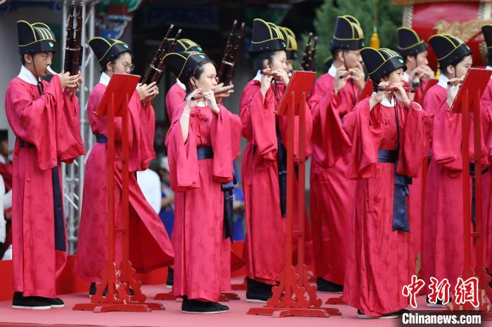 9月28日,臺(tái)北市各界紀(jì)念大成至圣先師孔子誕辰釋奠典禮在臺(tái)北孔廟舉行。圖為樂生在演奏中。中新社記者 陳小愿 攝